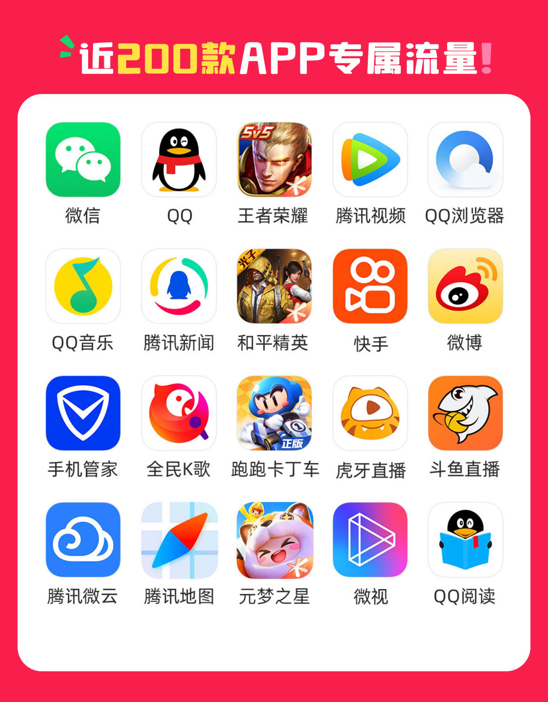 - 专属流量适用于腾讯系应用,具体应用列表请查看腾讯王卡助手